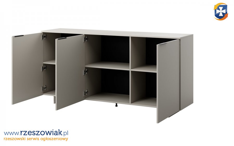 Jednym z dostępnych modeli jest komoda 3-drzwiowa z półkami Alma w kolorze kaszmir. Ten nowoczesny mebel doskonale pasuje do różnych wnętrz i stylów.
