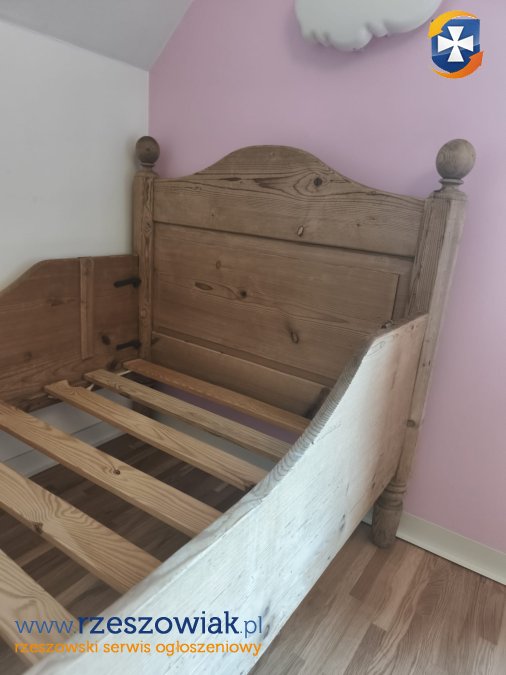Autentyczne, oryginalne łóżko sosnowe, idealnie odrestaurowane, pozbawione korników. Posiada naturalne ślady użytkowania wynikające z długiej historii.