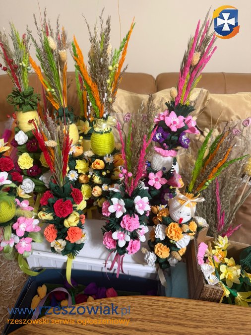 Każda palma jest robiona własnoręcznie z dużą dokładnością i dbałością o szczegóły, z kolorowych kwiatów, traw i ozdób. To tradycyjne rękodzieło, które świetnie sprawdzi się na Niedzielę Palmową lub jako dekoracja świąteczna.