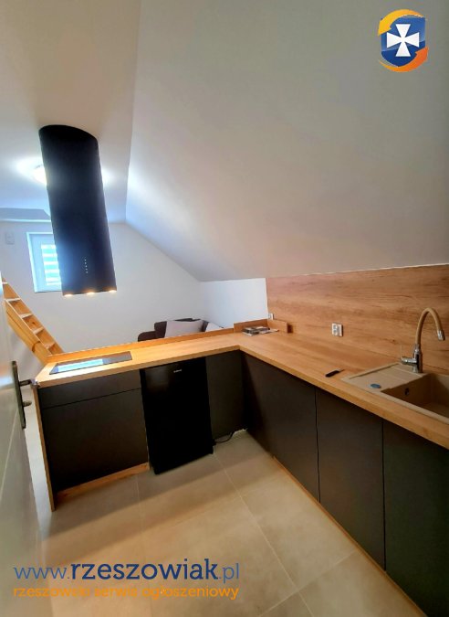 Na dole mieszkania znajduje się aneks kuchenny wyposażony w nowoczesny okap.
