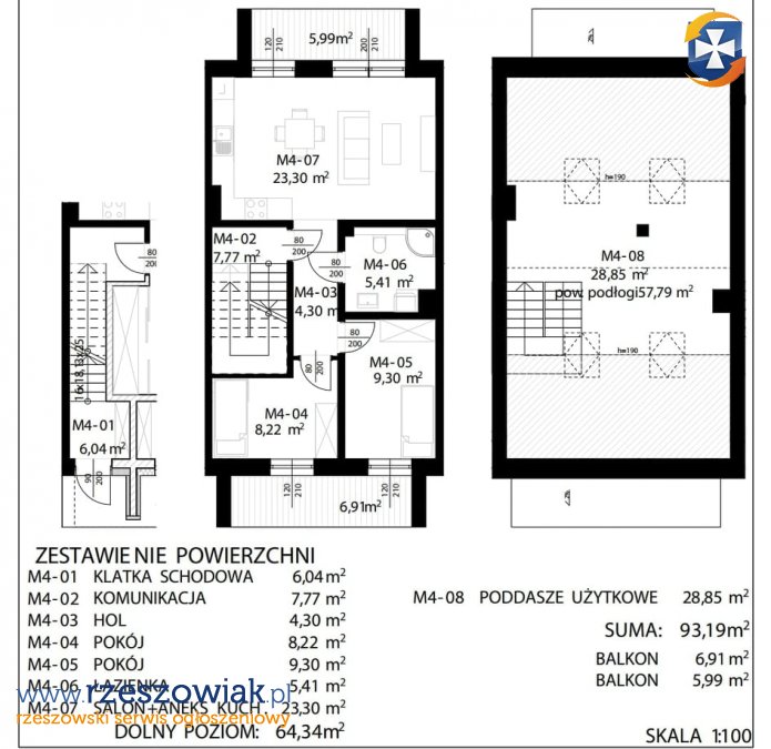 BEZ PROWIZJI !!! GODNE UWAGI !!! Do sprzedania mieszkanie w Rzeszowie - Budziwoju o powierzchni 93,19 m2 z dwoma balkonami. Mieszkanie w stanie deweloperskim. Położone na 1 piętrze + poddasze użytkowe. Budynek w zabudowie szeregowej, z odrębnym wejściem. W skład mieszkania wchodzi m.in.: 2 samodzielne pokoje, salon z aneksem kuchennym, przedpokój, łazienka z wc (razem ok.64m2) oraz poddasze użytkowe o powierzchni ok.29m2 (po podłodze ok.58m2). Dodatkowo dostępne są do mieszkania 2 miejsca postojowe!