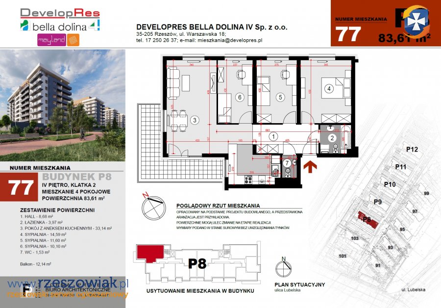 Przedstawiamy przestronne mieszkanie 4-pokojowe o pow. 83,61m2 na IV piętrze w nowoczesnym budynku P8 na osiedlu Bella Dolina (ul. Lubelska w Rzeszowie).