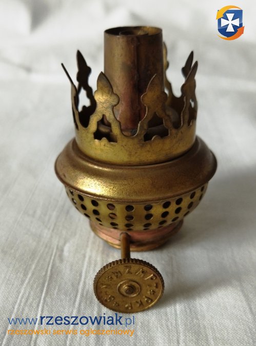 Brenner mosiężny palnik do lampy naftowej. Stan widoczny na fotografiach. Brenner nie był używany. Zachowany w pierwotnym, bardzo dobrym stanie. Nie był czyszczony ani poddany renowacji. Mechanizm jest sprawny.