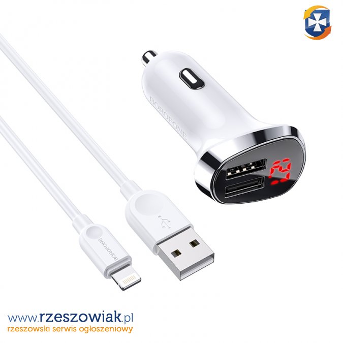 BZ15 Auspicious to ładowarka samochodowa z dwoma portami USB o mocy 2.4A każdy, mocy łącznej 2.4A maksymalnie, wyposażona dodatkowo w wyświetlacz LED, pokazujący stan akumulatora pojazdu na postoju i po rozruchu silnika, prąd i ampery podczas ładowania urządzenia mobilnego oraz kabel iPhone Lightning o długości 1M, przeznaczony do ładowania urządzeń mobilnych firmy Apple takich jak iPhone, iPad czy iPod.