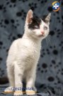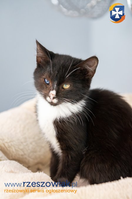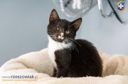 Krokiet - czarny z białym krawatem chłopczyk urodzony w lipcu 2025. Jest przepięknej urody dostojnym kocurkiem. Przeszedł koci katar, który pozbawił go widzenia w jednym oku, drugie jest zdrowe.