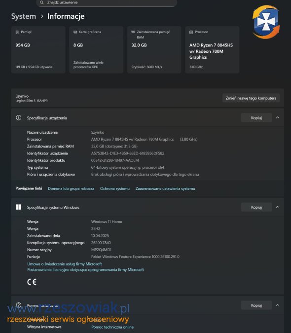Procesor: AMD Ryzen 7 8845HS (8 rdzeni, niesamowita wydajność przy świetnych temperaturach).