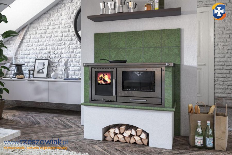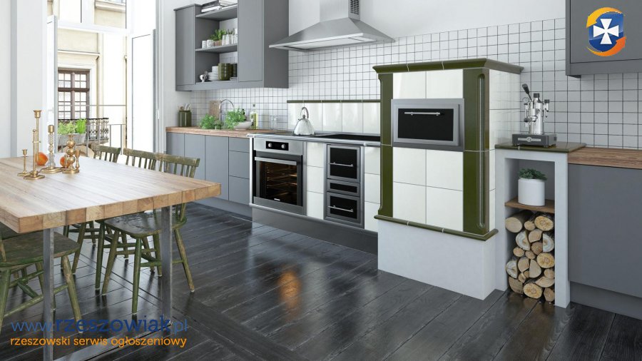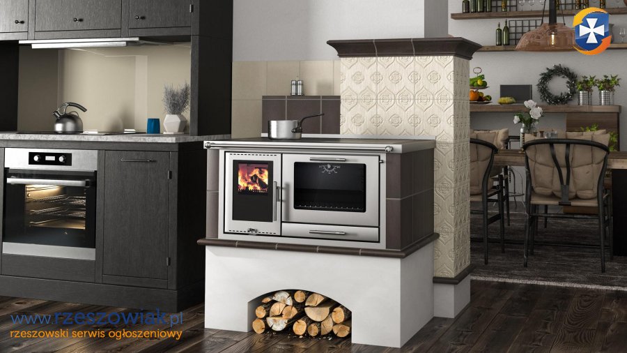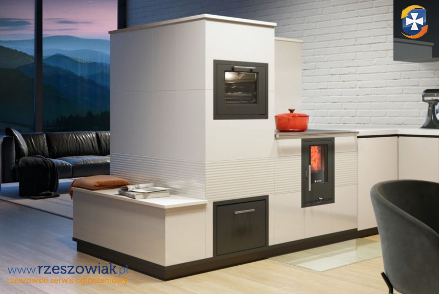Czy tradycyjny piec kuchenny może mieć zastosowanie w nowoczesnych domach energooszczędnych z mechaniczną wentylacją z odzyskiem ciepła (rekuperacją)? Nie tylko może, ale przewyższa inne urządzenia grzewcze jakością, użytecznością, efektywnością i sprawnością. Posiada zamkniętą komorę spalania (bezpośredni dopływ powietrza z zewnątrz, więc nie zakłóca właściwego bilansu powietrza wewnątrz domu), nowoczesne palenisko bezrusztowe z podwójnym przeszkleniem z zawsze czystą szybą, a do tego może być wyposażony w jeden lub dwa wymienniki wodne do CO. W zależności od posiadania ilości wymienników wodnych, może ogrzewać powierzchnie 75 m2 i 150 m2. Poprzez bufor, może współpracować z pompą ciepła, kotłem gazowym lub na pellet. Powstająca energia cieplna w palenisku, gromadzona jest w pojemnej masie ceramicznej i później wolno oddawana w czasie (powyżej 12 godzin) - poprzez przyjemnie rozgrzane powierzchnie ceramiczne kuchni - do pomieszczenia, w postaci zdrowego promieniowania podczerwonego (przyjaznego także dla alergików). Do tak rozgrzanej kuchni, przyjemnie jest przylgnąć, a nawet się przytulić. Temperatura w pomieszczeniach jest stabilna, a nie rozchwiana, jak przy tanim kominku konwekcyjnym. Nie ma też efektu przegrzania przestrzeni wokół niej. Długotrwałą i stabilną pracę urządzenia, i systemu grzewczego, zapewnia duża pojemność cieplna masy kumulacyjnej i automatyka, bo kuchnia może pracować w trybie automatycznym lub manualnym. W trybie automatycznym rozpalamy ogień w palenisku, wciskamy na centralce âstartâ, a automatyka steruje za nas procesami palenia, przy zawsze czystej szybie i wysokiej sprawności. Jest bardzo bezpieczna w użytkowaniu, gdyż sterownik nie pozwala na popełnianie błędów. Gdy zawiedzie główne ogrzewanie domu (awaria, brak prądu), jest bardzo dobrym zabezpieczeniem, gdyż może pracować bez automatyki. Obsługa takiej kuchni jest łatwa, przyjemna i komfortowa. Jest na drewno liściaste (także iglaste) i brykiety drzewne. Przy paleniu brykietami drzewnymi, nie musimy nawet rąbać drewna i go sezonować. Kupujemy je, wkładamy do paleniska, a automatyka sama dalej w nim pali, bez naszego dozoru. Możliwe palenie tylko 2 razy dziennie (rano i wieczorem), gdyż energia z drewna kumuluje się w ceramice, a nie ucieka do komina. Dzięki temu, jej rozgrzane ściany nigdy nie stygną. Posiada konstrukcję zapewniającą całkowite i zupełne spalanie drewna (także z wymiennikami wodnymi), przy minimalnej emisji spalin (zero dymu z komina) i zawsze czystych szybach. Nie truje środowiska. Spełnia wymagania Ekoprojektu i najsurowsze normy europejskie (od stycznia 2022 r. każdy nowo wybudowany piec, kuchnia lub kominek musi być zgodny z Ekoprojektem 2022). Przeznaczona jest do budowy stabilnych hybrydowych nowoczesnych instalacji grzewczych (akumulacja+woda+DGP), dostosowanych do indywidualnych potrzeb, będąc przy tym wyśmienitym urządzeniem kuchennym i ekologicznym źródłem ciepła. Doskonale sprawdza się w starych - mniej ocieplonych lub nieocieplonych - budynkach (także wielorodzinnych), w których ogrzewanie gazowe lub pompą ciepła jest drogie i nieefektywne. Jej piekarnik, wyłożony szamotem, bez problemu rozgrzewa się do ponad 300 stopni C! Z łatwością piecze pizze i chleby. Może być usytuowany za ścianą, w przyległym pomieszczeniu, w ścianie grzewczej i w tamtym pomieszczeniu użytkowany. Kuchnia może posiadać podwójnie przeszklone drzwi paleniska na przestrzał, z dwóch stron. Gdy będzie posadowiona na granicy dwóch pomieszczeń, ogień w palenisku będzie widoczny także w pomieszczeniu za ścianą. Gdy w obszerniejszej izbie kuchennej będzie zamontowana jako półwysep, ogień będzie widoczny po obu stronach kuchni, w każdym punkcie pomieszczenia. Nie ma innego urządzenia grzewczego, które by tak efektywnie i wszechstronnie wykorzystywało energię cieplną. Ona jedna posiada w sobie sumę zalet wszystkich innych dostępnych urządzeń na paliwa stałe. I samodzielnie, z powodzeniem, może je wszystkie zastąpić. Piec kuchenny, zamiast płaszcza kaflowego, może posiadać przyjemnie rozgrzane szamotowe ściany o strukturze surowego betonu lub drewna, ściany gładkie tynkowane lub tynkowane na styl starej polepy, obłożone kamieniem, cegłą lub spiekami kwarcowymi, ściany szamotowe malowane farbami dekoracyjnymi o szerokiej palecie efektów wizualnych i inne. Wszystkie wersje ścian wypromieniowują ciepło w sposób stabilny i zrównoważony. Dobrze zaprojektowany piec może być ozdobą kuchni rustykalnej, jak i tworzyć futurystyczne kompozycje wpisane w awangardowe wnętrza. Tradycyjna kuchnia nie musi być już tylko kaflowa, ale może mieć każdy rodzaj okładziny zewnętrznej, pasującej do wnętrza. Obłożona płytami z prawdziwego naturalnego betonu architektonicznego, świetnie wpisuje się w koncepcję domu nowoczesnego. W zależności od wyboru koloru i struktury płyty betonowej, uzyskuje się dopełnienie koncepcji klasycznej, skandynawskiej, minimalistycznej, loftowej lub industrialnej.