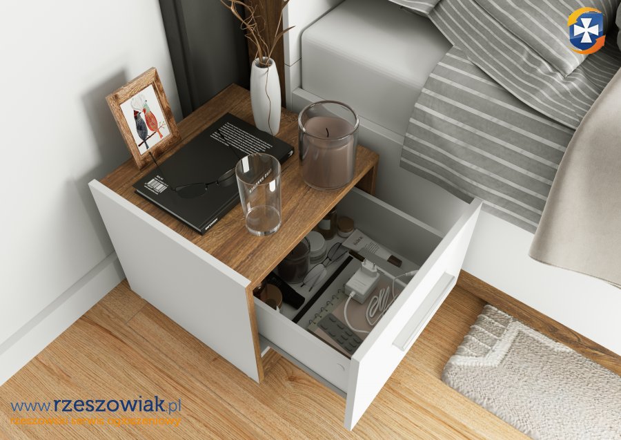 Zalecamy zakup materaca 160x200 cm. Łóżko wykonane jest z płyty laminowanej w kolorze białym matowym w połączeniu z dębowym stirlingiem.