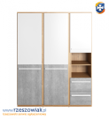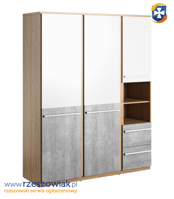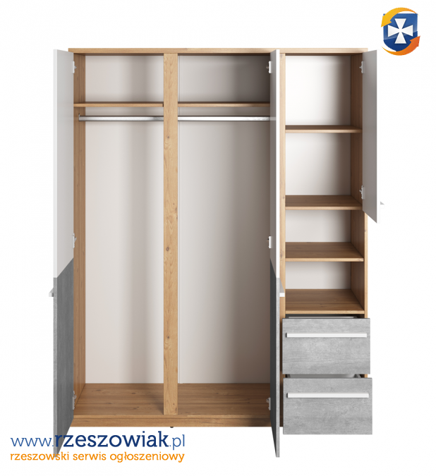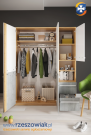 Długi drążek na wieszaki, półki do przechowywania i eksponowania, a nawet dwie pojemne szuflady.