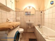 W łazience znajduje się wanna, wc, pralka, umywalka, oraz szafki do przechowywania środków czystości.