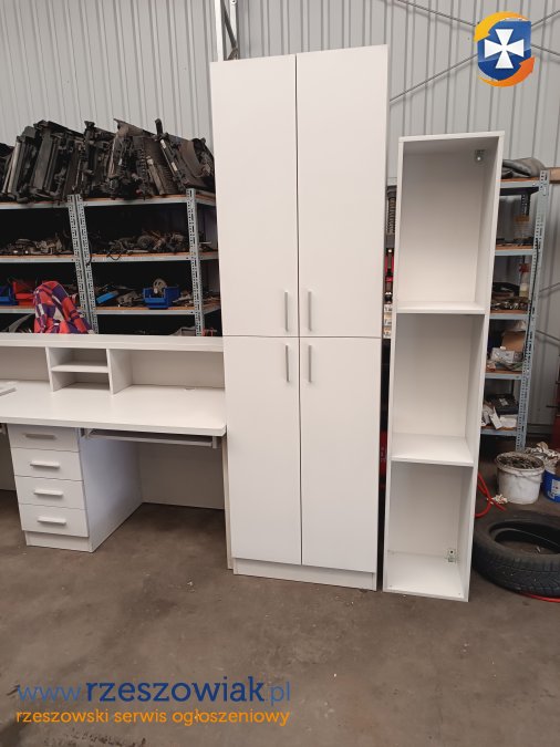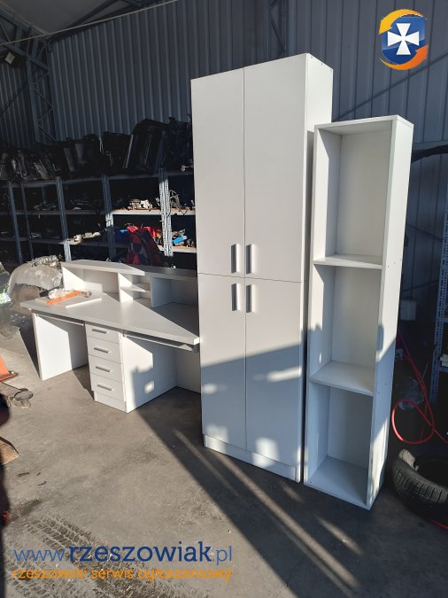 Do sprzedania kpl. mebli do biura, duże masywne biurko z dwoma miejscami do obsługi klientów, szafka wysoka zamykana na dokumentacje , dwie wiszące szafki otwarte, i mały słupek z szufladami pod drukarkę. Wszystko zdemontowane z powodu zmiany aranżacji, bez uszkodzeń i uzywane 3 lata, stan bdb, polecam, możliwy transport. Do oglądnięcia w Głogowie Młp. K. Rzeszowa. Mój tel . 791450623