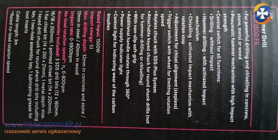 * w zestawie - 3 wiertła SDS (12 x 160mm 16 / 18 x 250mm), 1 punktak (14 x 250mm), 1 dłuto płaskie (14 x 250 x 21mm), 1 docisk do metalu, 1 uchwyt wiertła z wieńcem zębatym dla wiertła o okrągłym chwycie wraz z kluczem, 1 klucz montażowy z dwoma otworami, smar, praktyczna walizka do przechowywania, DOWÓD ZAKUPU.