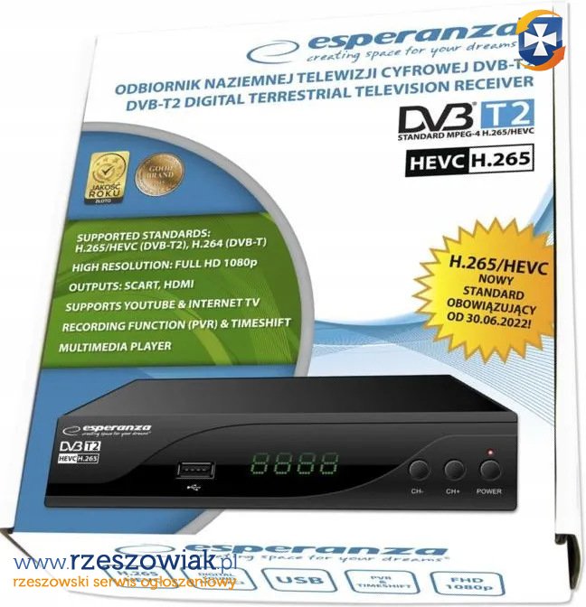 Do sprzedania NOWY dekoder Esperanza EV105 DVB-T2 H.265 HEVC InternetTV IPTV YouTube RJ-45 Wi-Fi. Pudełko/opakowanie z tym sprzętem jest fabrycznie zamknięte i ZAPLOMBOWANE przez producenta, więc nabywca ma pewność, że NIGDY NIE BYŁO OTWIERANE, a sprzęt NIGDY NIE BYŁ UŻYWANY. Model EV105 to ostatni model dekodera DVB-T2 H.265 HEVC wyposażony w złącze Ethernet RJ-45 do podłączenia Internetu więc obecnie trudno go kupić. Aktualnie u mnie NOWY ten dekoder NAJTANIEJ!!!