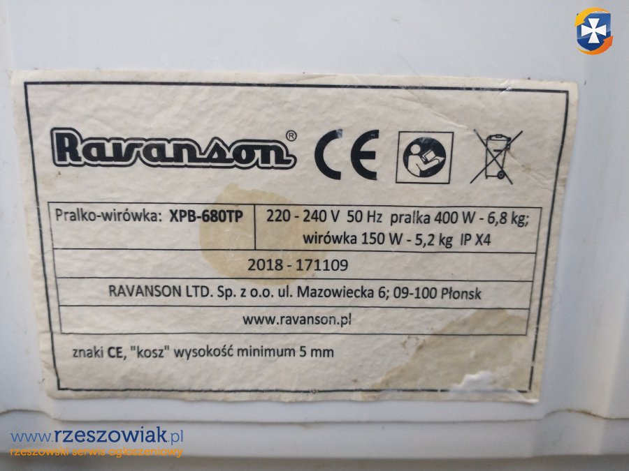 Do sprzedania pralko-wirówka Ravanson XPB-680TP, używana. Jest to pozostałość po lokatorach, którzy używali jej w wynajmowanym mieszkaniu. Jeśli chodzi o stan techniczny to działa i pierze pralka, natomiast nie działa wirówka. Nie wiem co jest tego przyczyną, może ktoś potrafi ją usprawnić. Czas pracy ustalany zegarem: dla pralki do max. 15 minut i dla wirówki do max. 5 minut. Oba zegary działają prawidłowo. Pobór mocy pralki 400W. Max. wsad to 6,8 kG. Pralka jest lekka, waży tylko 16 kG bo obudowa jest plastikowa, więc może ją przenieść 1 osoba. Cena niska z uwagi na opisaną usterkę. Do obejrzenia w okolicach Al. Niepodległości w Rzeszowie, w domu jednorodzinnym. Proszę dzwonić tylko w godz. 12-22.