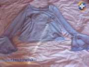Do sprzedania uzywana bluzka,w kolorze blekitnym,z dlugim rekawem,zakonczonym falbankami,zapinana na zamek z tylu.Szerokosc pod pachami 40 cm,na dole 54 cm,dlugosc 53 cm,dlugosc rekawa 31 cm +falbanka.