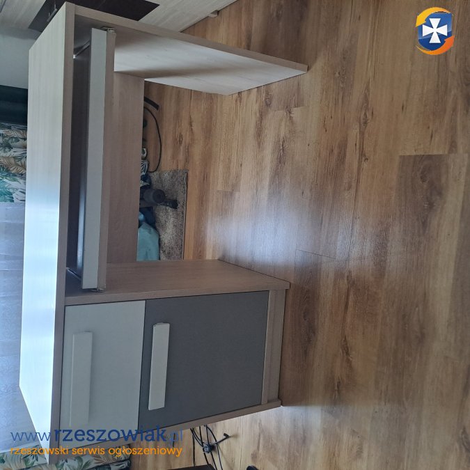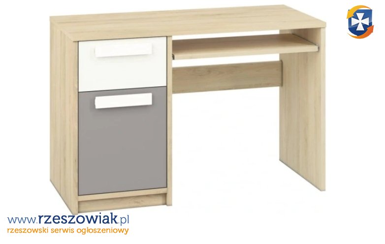 Mebel posiada półkę na klawiaturę, szufladę oraz szafkę, a także duży blat.