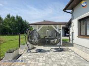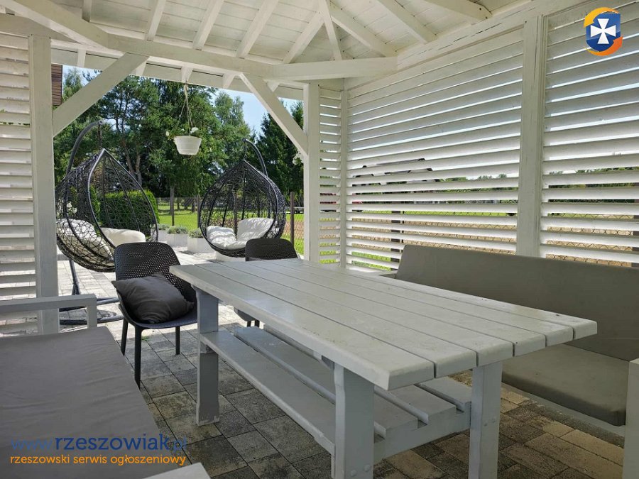 Przestrzeń dookoła domu uporządkowana i w większości zaaranżowana, z wydzieloną strefą wypoczynkową z altanką i pięknie obsadzonym bylinami tarasem, wyłożonym kostką brukową.