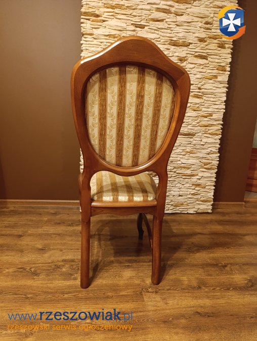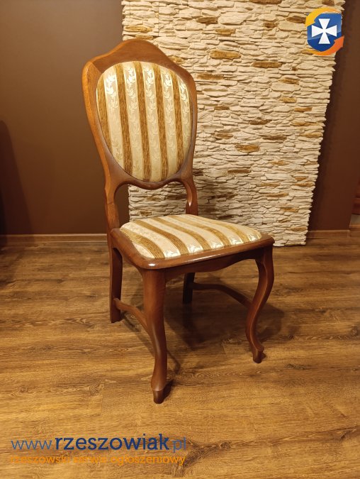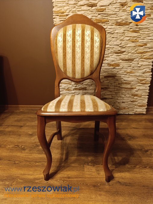 Krzesła drewniane tapicerowane z obiciem w brązowo-żółte paski. Mają stylowy wygląd. Są w bardzo dobrym stanie, mało używane. Na sprzedaż 6 krzeseł w cenie 600 zł za komplet.