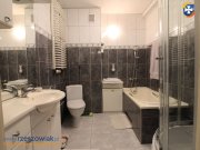 W sypialni duża szafa, łóżko. W łazience na wyposażeniu wanna i prysznic.