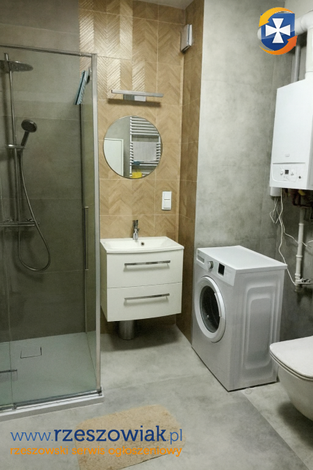 łazienka: prysznic z deszczownicą, pralka, słupek łazienkowy,
