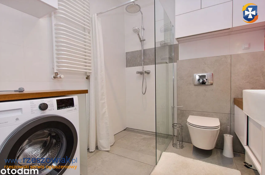 - łazienka z prysznicem odpływowym, meble na wymiar wraz z umywalką nablatową oraz pralka,