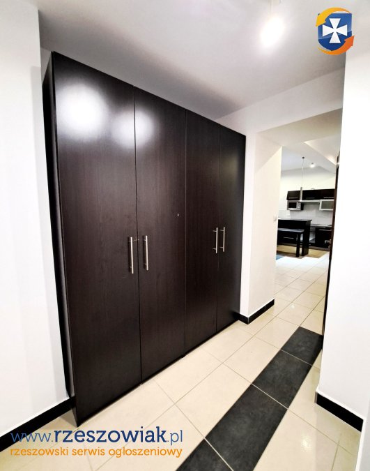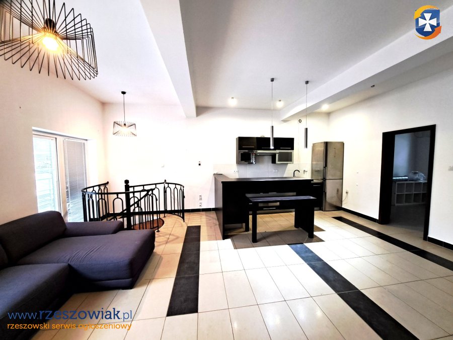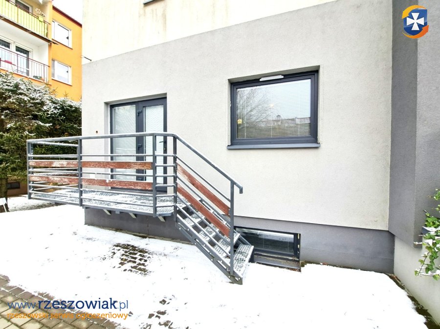 Mieszkanie składa się z dużego salonu z aneksem kuchennym, dwóch sypialni, łazienki z prysznicem i WC, przedpokoju, gabinetu w przyziemiu oraz komórki lokatorskiej w piwnicy. Kuchnia i łazienka w pełni wyposażone w meble i urządzenia AGD, w pozostałych pomieszczeniach wyposażenie częściowe. Miejsce parkingowe przynależne przy budynku lub ogólnodostępne na osiedlu. Do mieszkania prowadzą dwa wejścia: z klatki schodowej oraz bezpośrednio od strony parkingu.