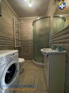 Łazienka w płytkach podłogowych i ściennych, umywalka, WC, pralka, prysznic, piec dwu-funkcyjny.