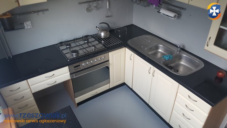 Kuchnia wyposażona w naczynia, umeblowana, ze sprzętami AGD: piekarnik elektryczny, płyta gazowa, lodówka z zamrażarką, mikrofala.