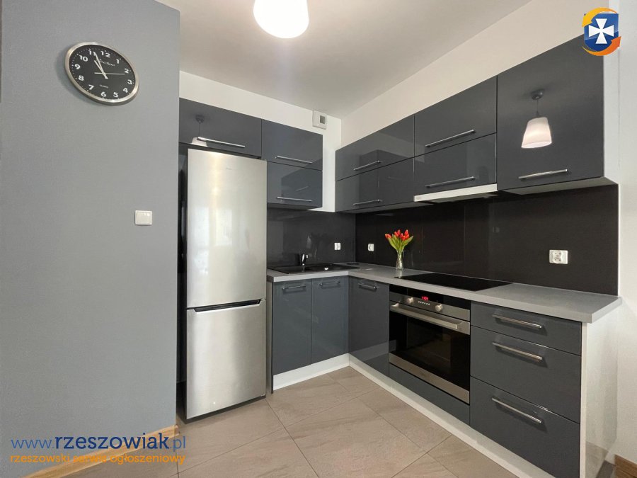 Aneks kuchenny wyposażony w piekarnik, płytę indukcyjną, okap, lodówkę.