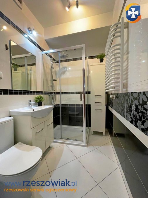 W przedpokoju szafy zabudowane. Łazienka w płytkach podłogowych oraz ściennych z natryskiem , wc, wyposażona w pralkę.
