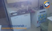 W przedpokoju szafy obite boazerią. W łazience pralka automatyczna. W kuchni szafki, kuchnia z piekarnikiem elektrycznym, zlewozmywak, lodówka i czajnik bezprzewodowy. W szafkach naczynia, sztućce, garczki).