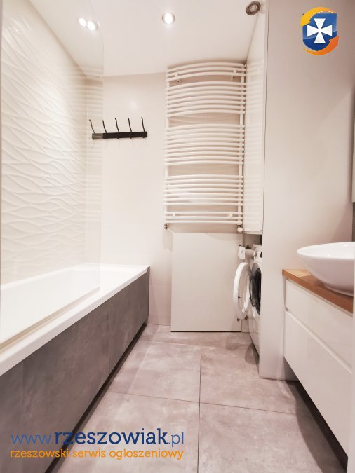 Łazienka - wanna z funkcją prysznica oraz nowoczesna pralka.