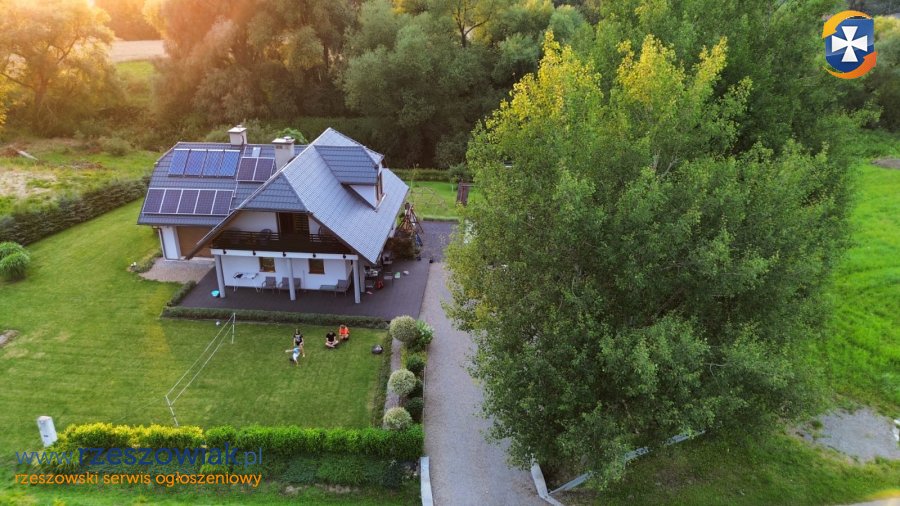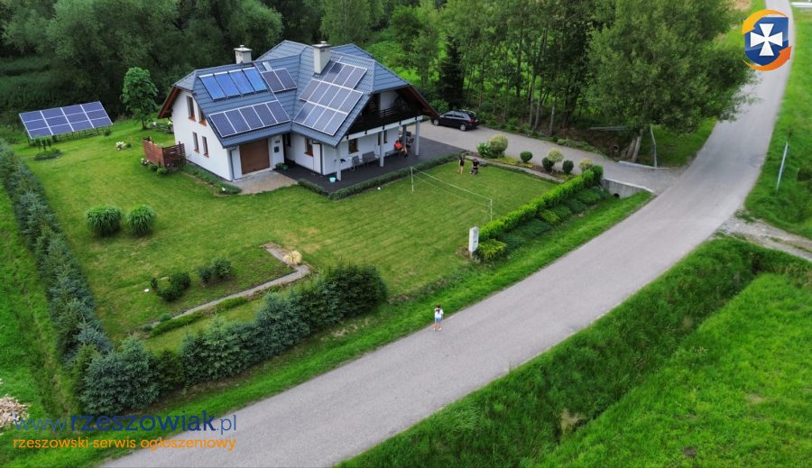 Dom jednorodzinny z poddaszem użytkowym, solary, fotowoltaika, ogrzewany panelami na podczerwień na prąd. Zeroemisyjny. Światłowód. Działka 18a . Robot koszący poprowadzony po całości. Powierzchnia domu ok. 150m2. Parter: 2 pokoje ok 7m2, łazienka, kotłownia z zbiornikiem na wodę, garaż jednostanowiskowy zaadaptowany pod siłownię, salon z jadalnią i aneksem kuchennym. Poddasze 3 pokoje ok 18m2 każdy, otwarty mini salon, łazienka.