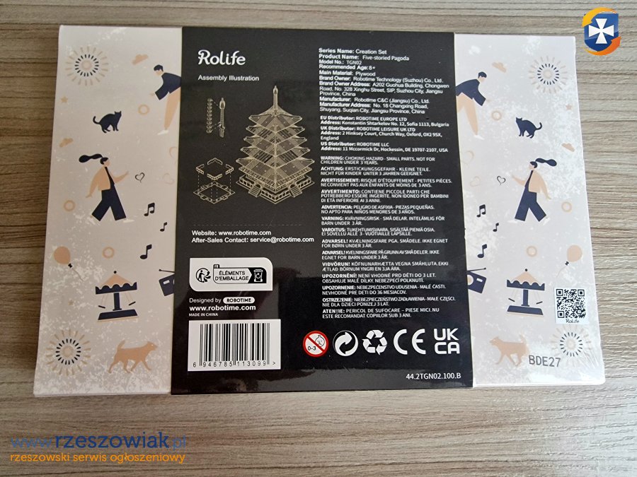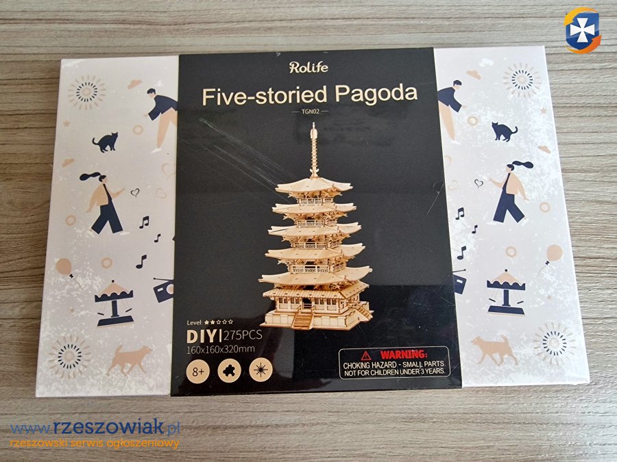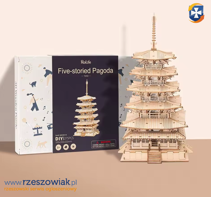 Drewniane puzzle, zawierające przejrzystą instrukcję obsługi w języku angielskim, bez użycia kleju i narzędzi. Czas montażu wynosi około 2,5 godziny, co jest idealne na relaksujący i użyteczny projekt DIY zarówno dla starszych dzieci jak i dla dorosłych. Gotowy produkt to piękny i realistyczny model pięciopiętrowej pagody o wymiarach 160x160x320 mm.