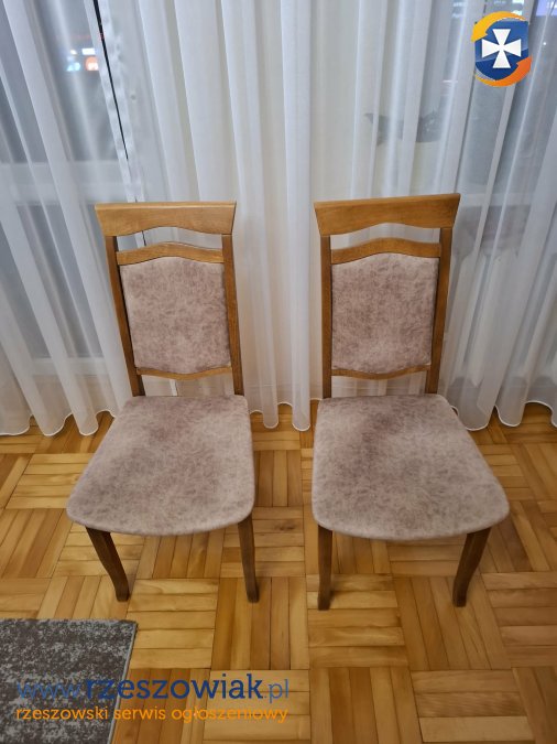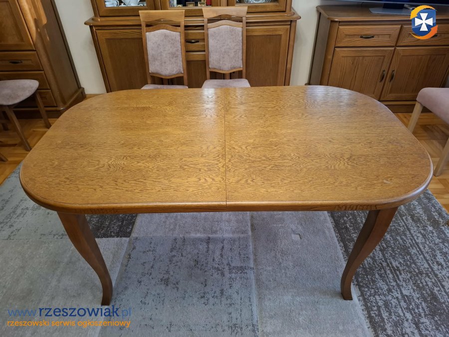 Drewniany owalny stół, rozsuwany. Stan bardzo dobry bez żadnych uszkodzeń. Krzesła w stanie dobrym.