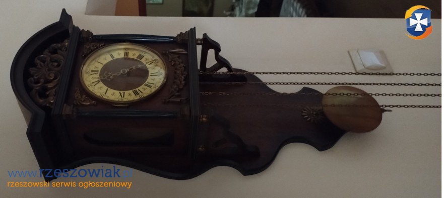 Duży piękny zegar ścienny z wahadłem. Nakręcany na chodzenie i na bicie poprzez podciąganie ciężarków. Zegar pięknie wybija godziny i połówki. Dźwięk miły, łagodny, stonowany (bim bam).