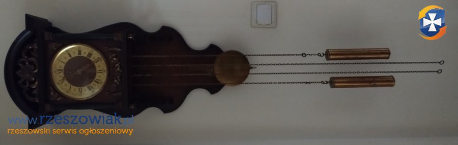 Duży piękny zegar ścienny z wahadłem. Nakręcany na chodzenie i na bicie poprzez podciąganie ciężarków. Zegar pięknie wybija godziny i połówki. Dźwięk miły, łagodny, stonowany (bim bam).