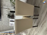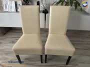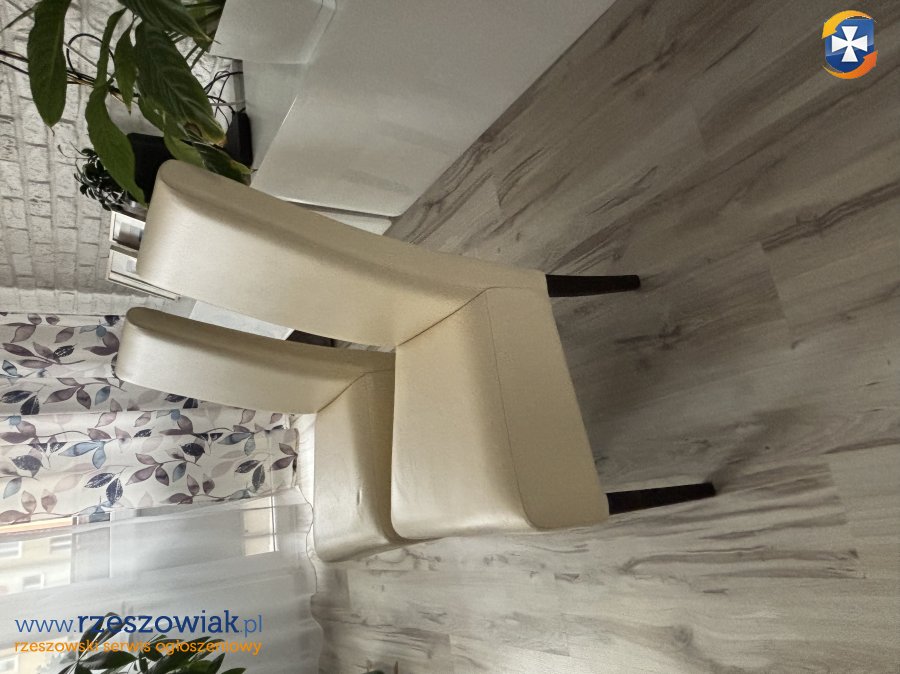 Krzesła drewniane z beżowym obiciem imitującym skórę. Są wytrzymałe i łatwe w utrzymaniu czystości.
