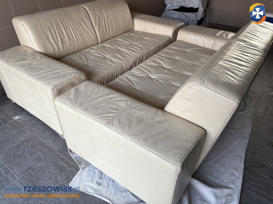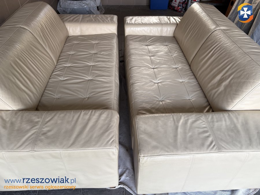 Dwie wygodne sofy w kolorze beżowym. Noszą ślady użytkowania, ale są niezwykle wygodne. Skóra była systematycznie impregnowana więc stan jest bardzo dobry, bez przetarć.