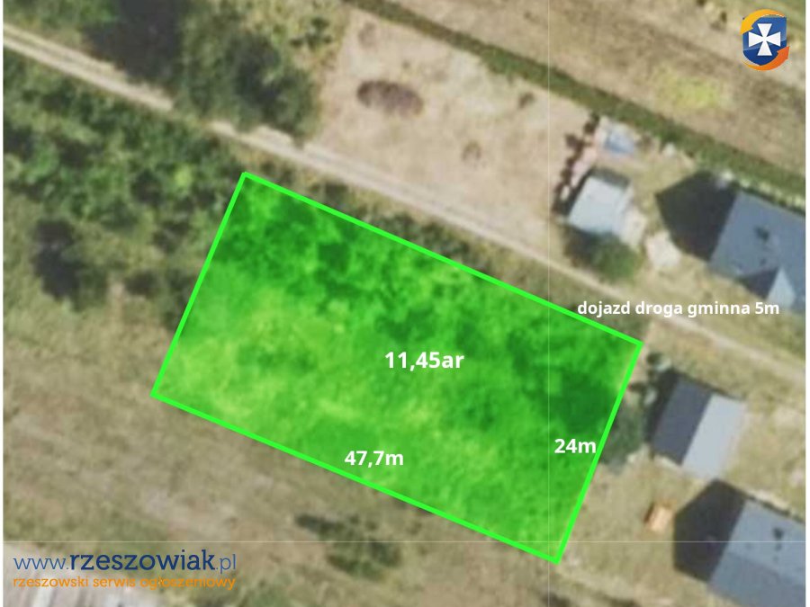 Działka budowlana o pow. 11,45ar o wymiarach 47,7m x 24m, płaska o kształcie prostokąta. Działka z pozwoleniem na budowę i gotowym projektem domu parterowego. Przeprowadzone badania geologiczne.