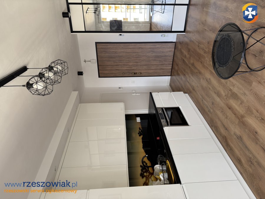 Kawalerka urządzona w stylu nowoczesnym. Salon połączony z kuchnią wyposażoną m.in. w zmywarkę i piekarnik oraz płytę indukcyjną i lodówkę. Meble w salonie wykonane na wymiar przez stolarza. Internet wliczony w cenę wynajmu. Telewizor zamontowany na ścianie wchodzi w skład wyposażenia.