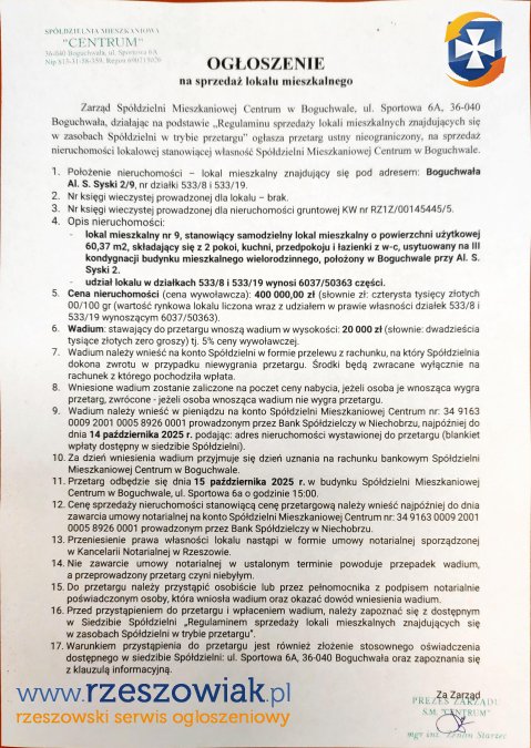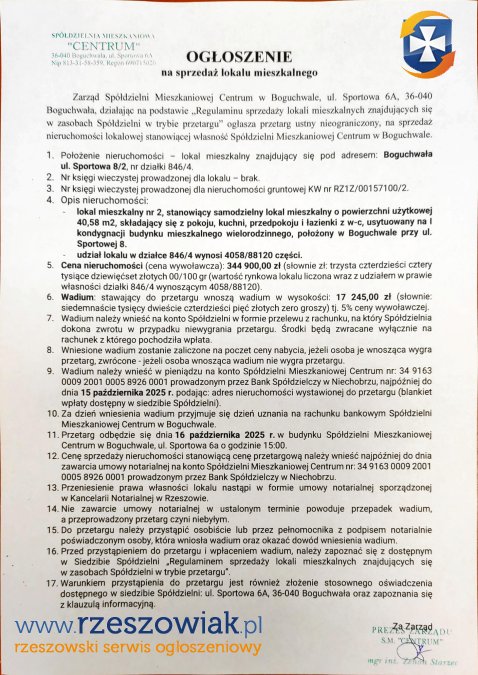 Dzień dobry. Spółdzielnia Mieszkaniowa Centrum w Boguchwale sprzeda w drodze przetargu dwa lokale mieszkalne o powierzchni 40,5 m2 oraz 60,5 M2. Przetarg odbędzie się w dniach 14 i 15 października. Kontakt 17 87 15 121. Mieszkania do oglądnięcia w ustalonym terminie ze spółdzielnią.Szczegóły w załącznikach.
