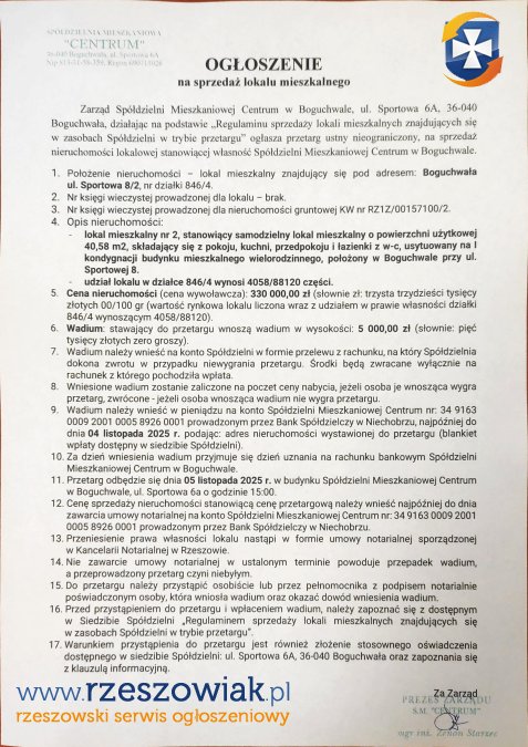 Dzień dobry. Spółdzielnia Mieszkaniowa Centrum w Boguchwale sprzeda w drodze przetargu dwa lokale mieszkalne o powierzchni 40,58 m2 oraz 60,37 M2. Przetarg odbędzie się w dniach 05 i 06 listopada 2025 r. Kontakt 17 87 15 121. Mieszkania do oglądnięcia w ustalonym terminie ze spółdzielnią. Szczegóły w załącznikach.