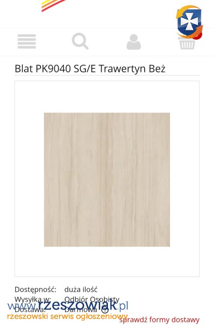 Załączam zdjęcia blatu zrobione w sklepie oraz screen ze strony sklepu. Osoby zainteresowane, jeśli chcą, mogą tez otrzymać zdjęcia zapakowanej paczki.