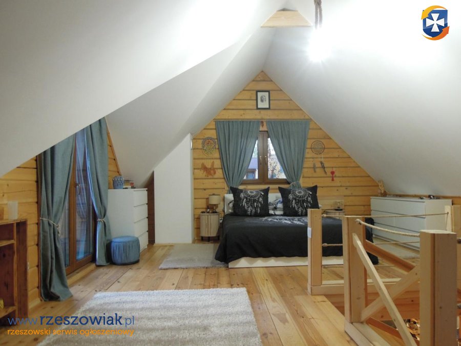 Na poddaszu zaś mieści się przestronna sypialnia z wyjściem na balkon. Istnieje możliwość zrobienia dwóch pokoi.