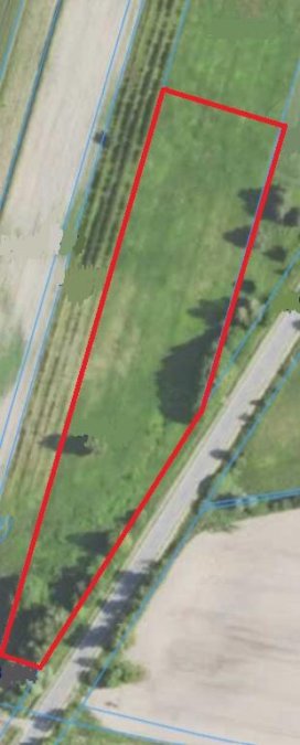 Sprzedawana działka ma kształt nieregularny, zbliżony do prostokąta o wymiarach: 257m długości x 53m szerokości w najszerszym miejscu, a w węższym miejscu 30 m.