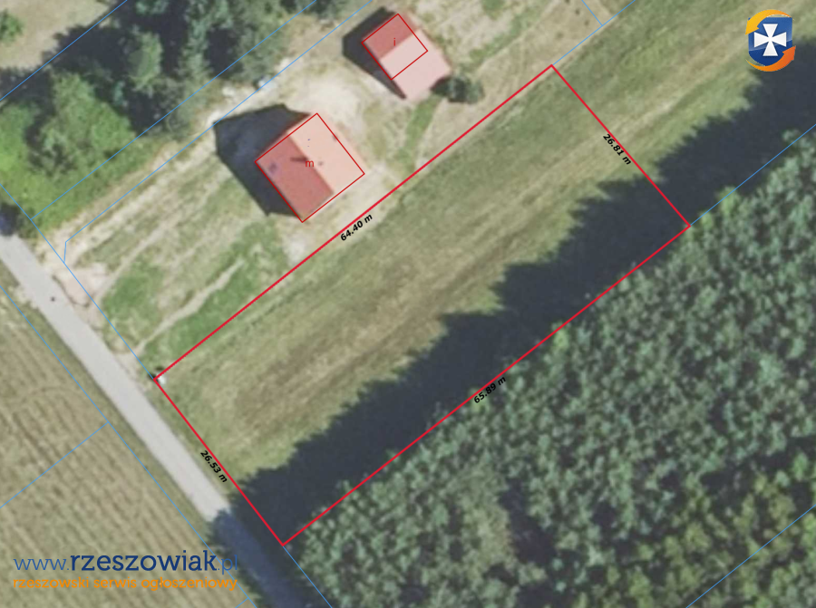 Działka o regularnym kształcie o wym.: 27m x 65m.