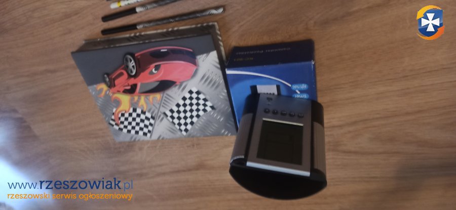 Elektroniczny organizer( czas, data, temperatura)pudełko z karteczkami i spinaczami biurowymi,nowe ołówki 9 szt