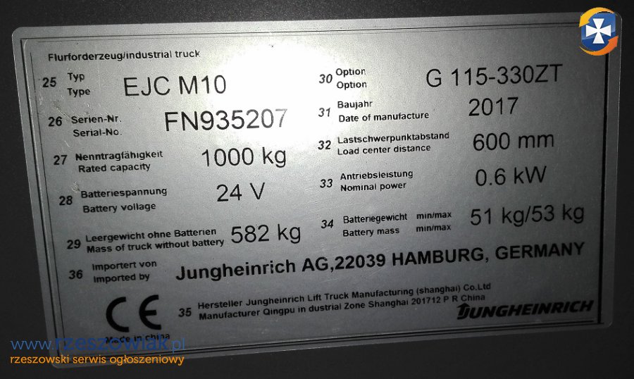 Dane techniczne i opis z katalogu wózka Jungheinrich: