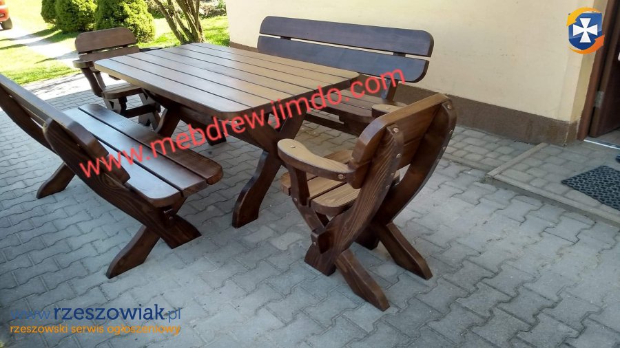 stół + 2 ławki +2 fotele z podłokietnikami.